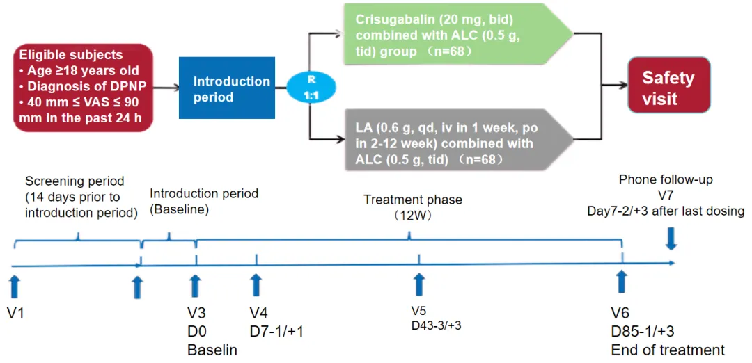 一项为期16周的多中心、随机、开放标签、阳性对照、平行分组、Ⅱ期临床试验,纳入40 mm≤VAS≤90 mm的DPNP成人患者。将受试者按照1:1随机给予克利加巴林(20 mg,bid)联合ALC(0.5 g,tid)或LA(0.6 g,qd,第1周静脉注射,随后2~12周口服给药)联合ALC(0.5 g,tid)治疗12周(图4)。