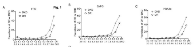图1.基于FPG、2hPG和HbA1c水平分布的十等分来划分的DKD和DR的患病率情况