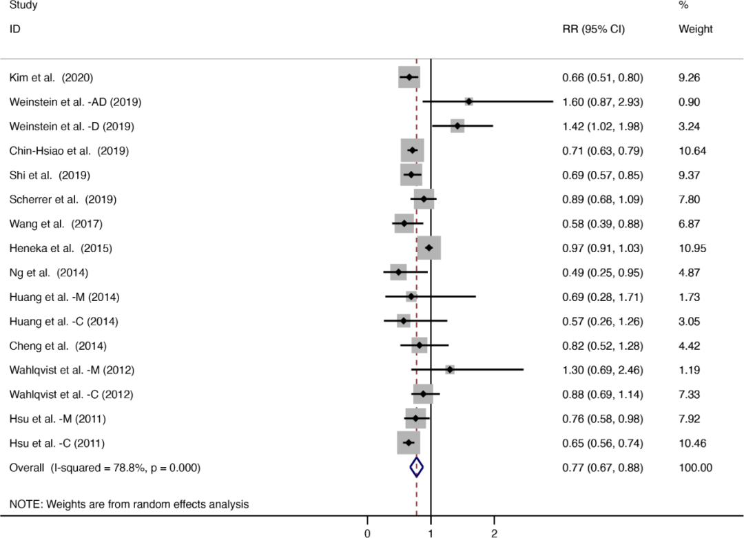 图3. Meta分析显示,使用二甲双胍的糖尿病患者全因痴呆风险较非使用者降低23%