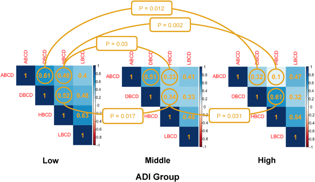 为整合多疾病风险,研究者提出了一个三维、跨文化、心血管代谢慢性疾病(tCMBCD)模型,涵盖肥胖相关疾病(ABCD)、血糖异常相关疾病(DBCD)、高血压相关疾病(HBCD)、血脂异常相关疾病(LBCD)[5]。研究表明,社会因素显著影响心血管代谢疾病关联:在区域剥夺指数(ADI)较高地区(ADI分数越高,表示社会经济条件越差),ABCD与DBCD的相关性(r=0.32)远低于ADI较低地区(r=0.61,P=0.012)(图1)。这一结果提示,跨文化管理需优先考量社会环境差异[5]。
