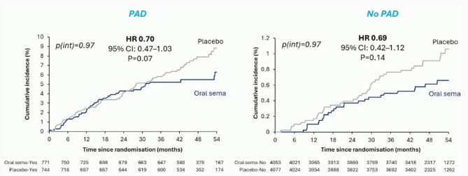 在无PAD的患者中,口服司美格鲁肽显著降低复合心血管事件风险达18%(P=0.002);合并PAD的患者虽无统计学显著获益,但交互P值(0.22)表明PAD不影响口服司美格鲁肽的疗效。扩展终点(额外纳入因不稳定心绞痛住院或血运重建)分析结果一致(交互P值=0.67)。