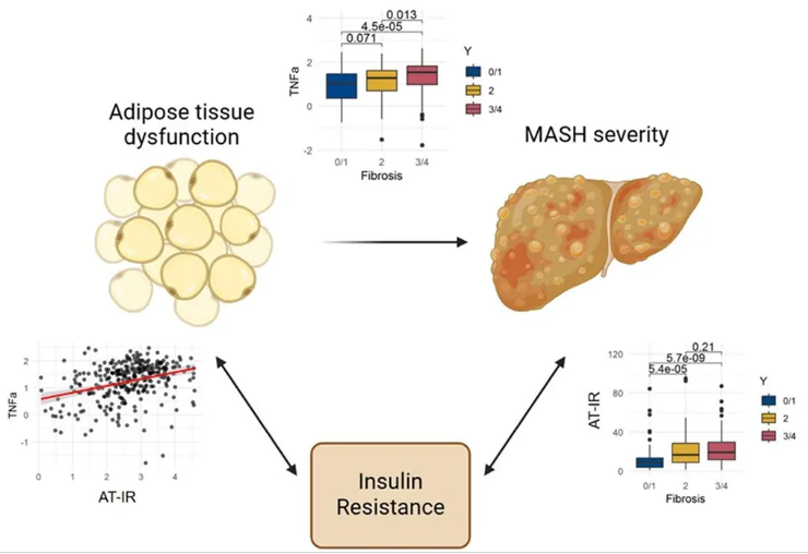 图1. MASH严重程度与脂肪组织功能障碍、胰岛素抵抗的相关性(图引自讲者摘要或幻灯)