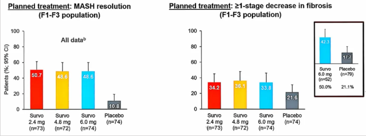 图5. Survodutide治疗MASH伴纤维化患者48周的结果分析(图引自讲者摘要或幻灯)