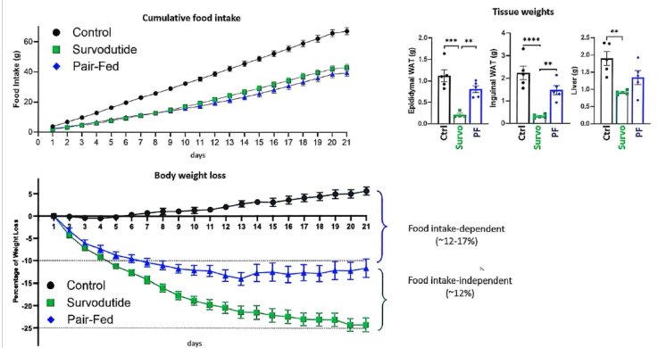 图8. Survodutide对肥胖小鼠体重及脂肪组织重量的影响(图引自讲者摘要或幻灯)