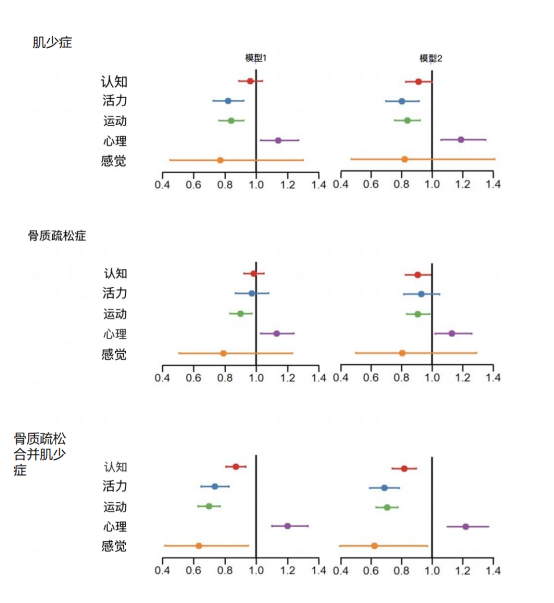 该研究分析了IC各个维度与肌少症、骨质疏松及骨质疏松合并肌少症之间的关系,模型1未进行调整;模型2则调整了性别、教育水平、吸烟情况及药物使用数量。(图1)。结果显示,认知能力提高与骨质疏松合并肌少症风险降低存在显著关联(OR=0.871,95%CI:0.808~0.933);活力水平处于较高状态时,可显著降低肌少症(OR = 0.820,95%CI:0.725~0.920)以及骨质疏松合并肌少症(OR=0.736,95%CI:0.648~0.826)的发生风险;运动能力增强也能够显著降低肌少症(OR=0.841,95%CI:0.764~0.920)、骨质疏松(OR=0.901,95%CI:0.832~0.972)以及骨质疏松合并肌少症(OR=0.699,95%CI:0.629~0.767)的发生风险。 心理维度得分较高与肌少症(OR=1.140,95%CI:1.030~1.270)、骨质疏松(OR=1.130,95%CI:1.030~1.240)及骨质疏松合并肌少症(OR=1.200,95%CI:1.100~1.330)的风险增加相关;而感官功能评分较高则显著降低骨质疏松合并肌少症的风险(OR=0.633,95%CI:0.417~0.950)。