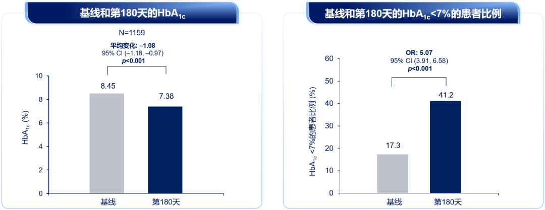研究结果显示,在主要研究终点上,在接受德谷胰岛素利拉鲁肽持续治疗的1159例患者中,第180天时,患者HbA1c水平从基线8.45%降至7.38%,降幅达1.08%(P<0.001);HbA1c<7%的患者比例从基线17.3%显著增至41.2%(P<0.001,图1)。在次要终点上,治疗180天时,患者FPG从基线9.90 mmol/L显著降至7.56 mmol/L,降幅为2.34 mmol/L(P<0.001);PPG从基线11.91 mmol/L显著降至9.81 mmol/L,降幅为2.10 mmol/L(P<0.001);胰岛素日剂量从34.54 U/d显著降至29.63 U/d,减少4.95 U/d(P<0.001)。