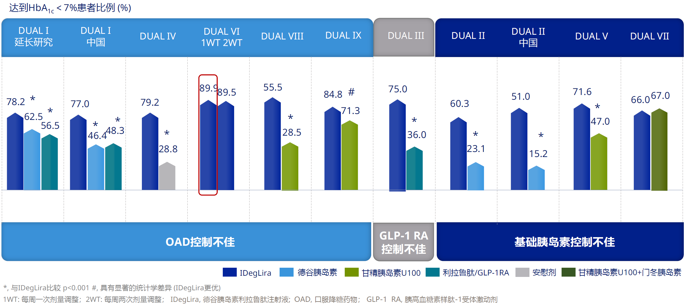 图2. DUAL系列研究:德谷胰岛素利拉鲁肽治疗的HbA1c达标率高达89.9%