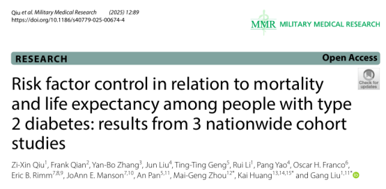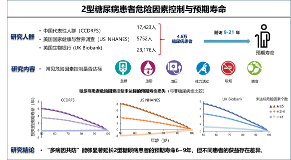 2型糖尿病已成为全球重大公共卫生挑战。糖尿病不仅显著增加心血管疾病等并发症的风险,而且会影响患者的预期寿命。研究团队前期基于具有全国代表性的13.5万名中国城乡居民发现,与血糖正常人群相比,糖尿病患者的心血管病死亡风险会显著增加59%,预期寿命平均缩短4.2年(Diabetes Care 2024,共同通讯)。然而,糖尿病患者中血糖、血脂、血压以及生活方式等“多病因共防”,其预期寿命可以增加多少?不同患者的健康获益是否存在差异?另外,目前糖尿病管理中更加侧重通过药物控制血糖、血脂、血压等代谢因素达标,而生活方式因素管理相对不足,二者的健康获益有何不同?目前,相关代表性人群的研究证据缺乏。
