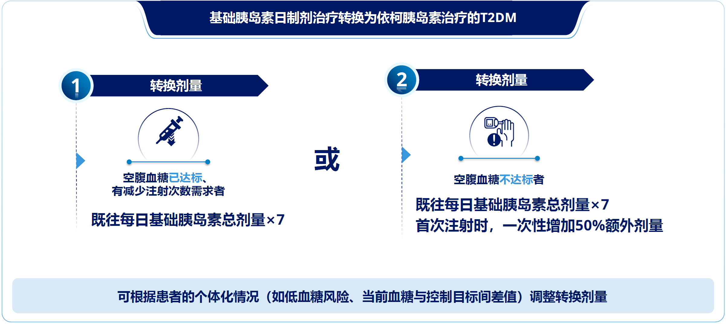 适用人群:需要使用基础胰岛素治疗的成人T2DM患者,包括:①未使用过胰岛素者,在生活方式干预基础上,经口服降糖药(OAD)治疗3个月HbA1c仍未达标,可起始依柯胰岛素治疗;②已使用胰岛素日制剂者,若空腹血糖(FPG)已达标但有减少注射次数需求,或者FPG仍未达标,可转换为依柯胰岛素治疗[6]。