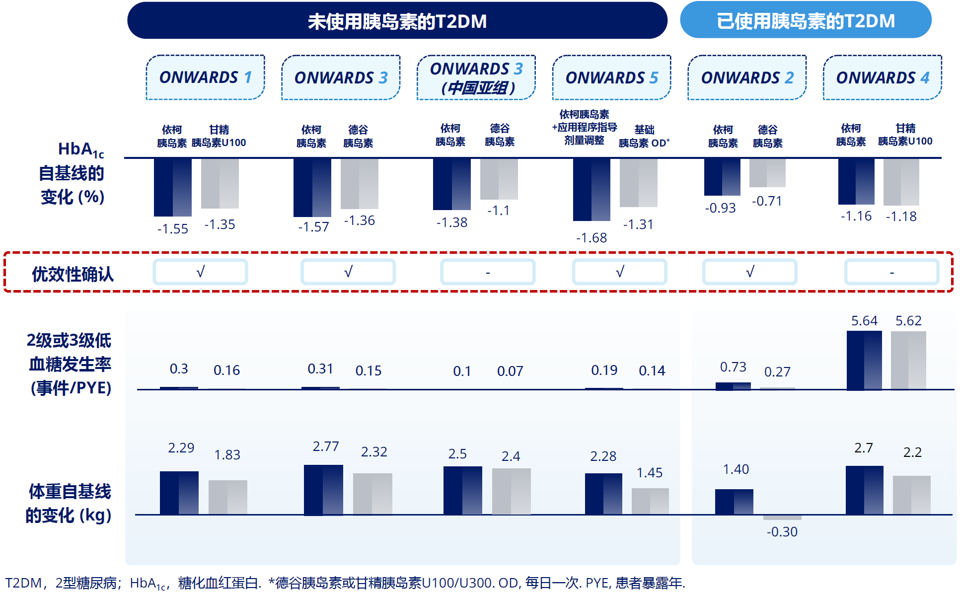 ONWARDS 1~5研究主要结果显示,起始或转换为依柯胰岛素治疗兼具疗效和安全性:可使HbA1c自基线降低0.93%~1.68%,疗效非劣于甚至优于基础胰岛素日制剂;同时,低血糖发生率和体重变化与基础胰岛素日制剂无显著差异[6](图2)。