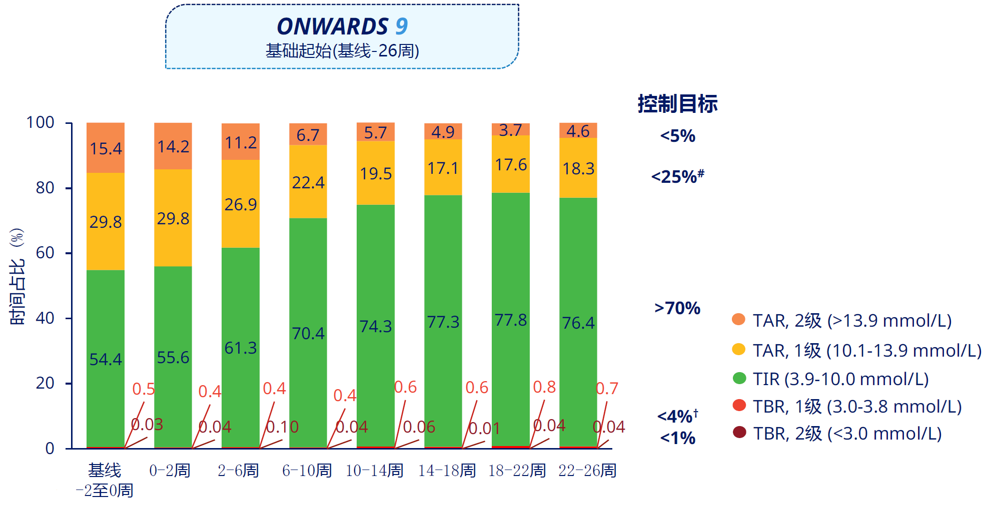 CGM数据进一步表明,依柯胰岛素治疗的葡萄糖目标范围内时间(TIR)在既往未使用胰岛素的T2DM患者中(ONWARDS 1)显著优于甘精胰岛素U100[11],在既往已使用胰岛素的T2DM患者中(ONWARDS 2和4)与基础胰岛素日制剂相当[14,15];ONWARDS 9研究显示,对于既往未使用胰岛素的T2DM患者,起始依柯胰岛素治疗2周内TIR即稳步增加、葡萄糖高于目标范围时间(TAR)稳步降低,随后达到并维持目标水平,葡萄糖低于目标范围时间(TBR)始终维持在目标范围内(图3)[16]。