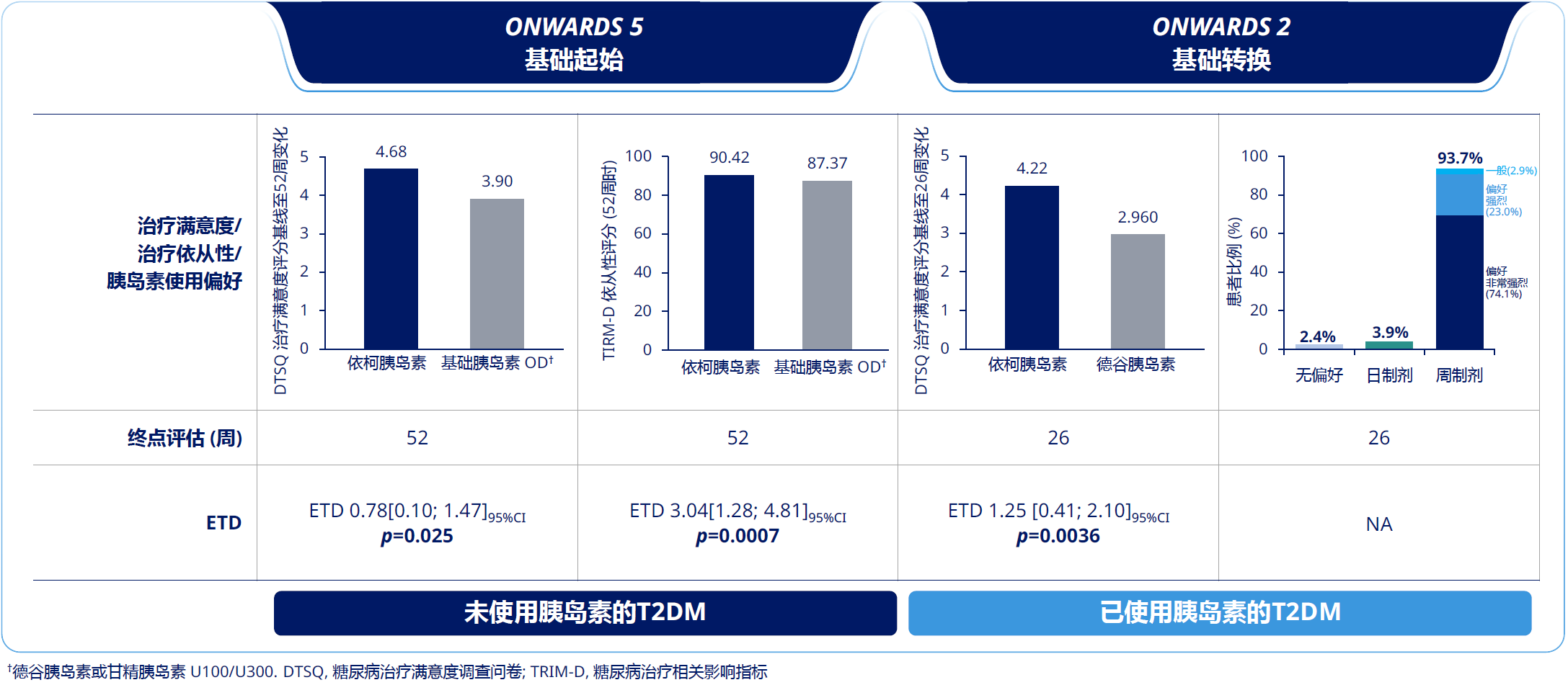 ONWARDS 2和4研究的患者报告结局分析显示,依柯胰岛素治疗满意度与依从性显著优于基础胰岛素日制剂,93.7%的患者更倾向于选择周制剂,选择的主要原因是注射频次少、使用方便和更好地控制血糖(图4)[17]。