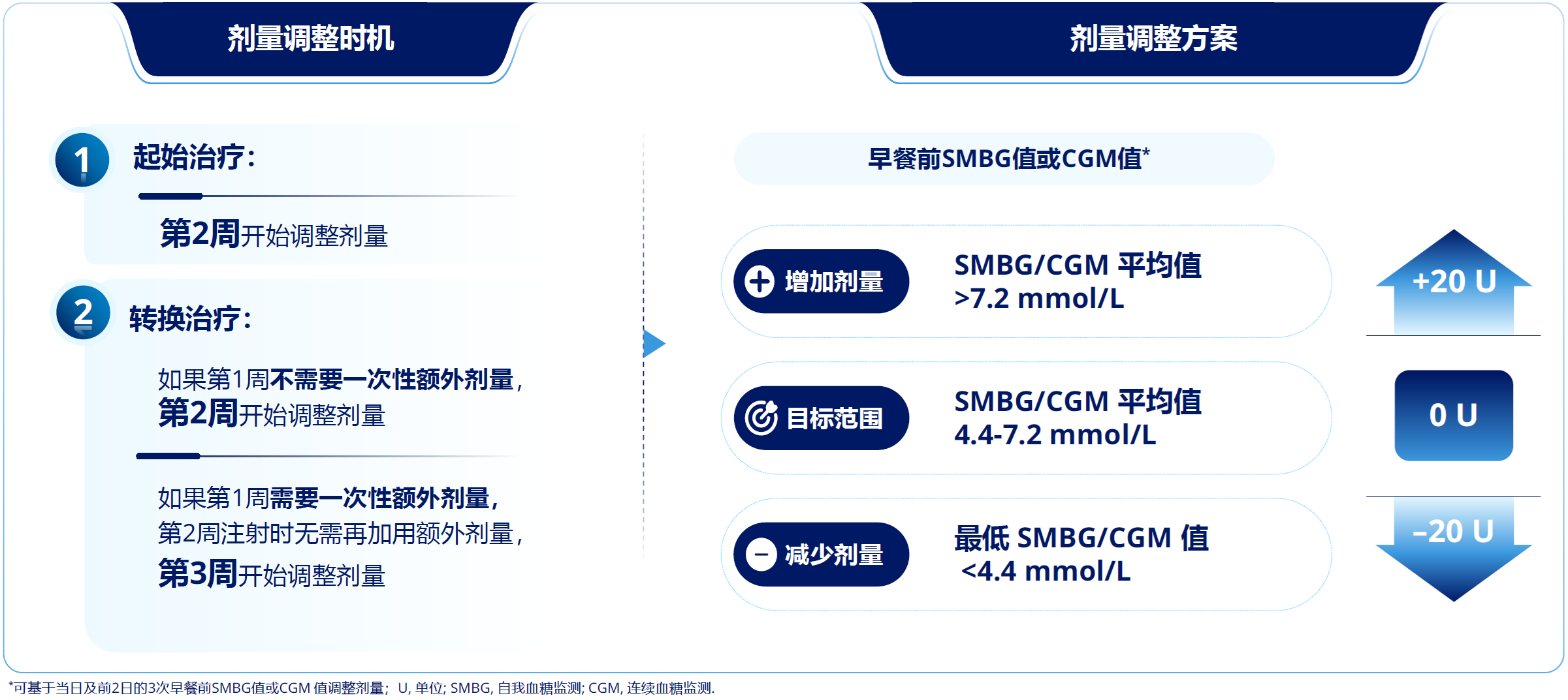 起始、转换与剂量调整:起始依柯胰岛素治疗时,推荐剂量为70 U/周起始或参考基础胰岛素日制剂剂量×7;转换为依柯胰岛素治疗时,推荐剂量为既往每日基础胰岛素总剂量×7,并根据FPG达标情况选择是否使用一次性50%额外剂量;依柯胰岛素可基于早餐前自我血糖监测(SMBG)或CGM值,每周调整剂量一次[6](图5)。
