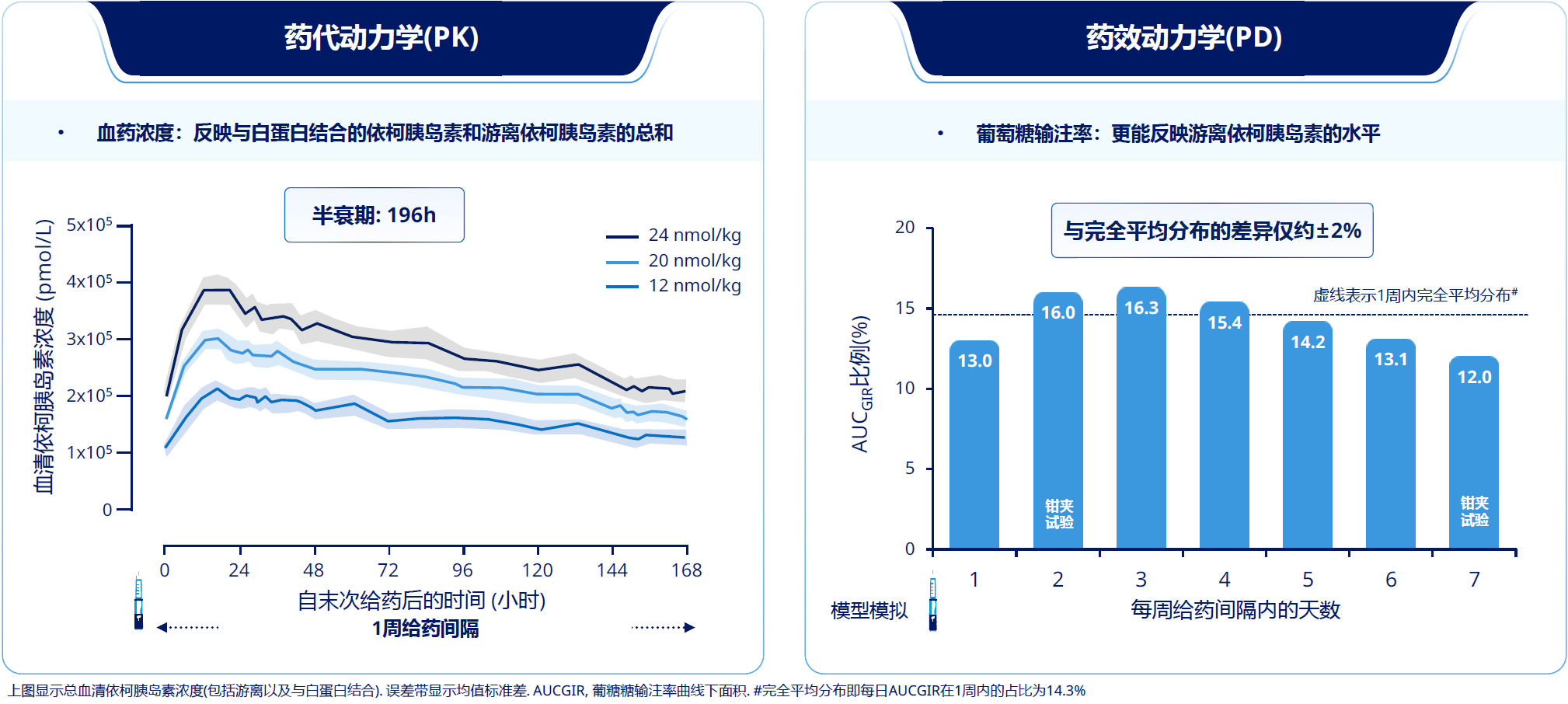 依柯胰岛素通过创新分子设计,实现每周一次皮下注射。其分子结构去除人胰岛素B30位的苏氨酸,并在B29位连接20碳脂肪酸侧链,同时对3处氨基酸进行替换。这些修饰使其能够强效且可逆地结合白蛋白形成储库,并从储库中缓慢、稳定释放,发挥持续平稳的降糖作用[6]。药代动力学/药效学(PK/PD)研究显示,依柯胰岛素半衰期长达196小时,且降糖疗效在一周内接近平均分布[6,9](图1)。此外,在不同程度的肝肾功能损害患者中,其PK特征不受白蛋白水平的影响[10]。