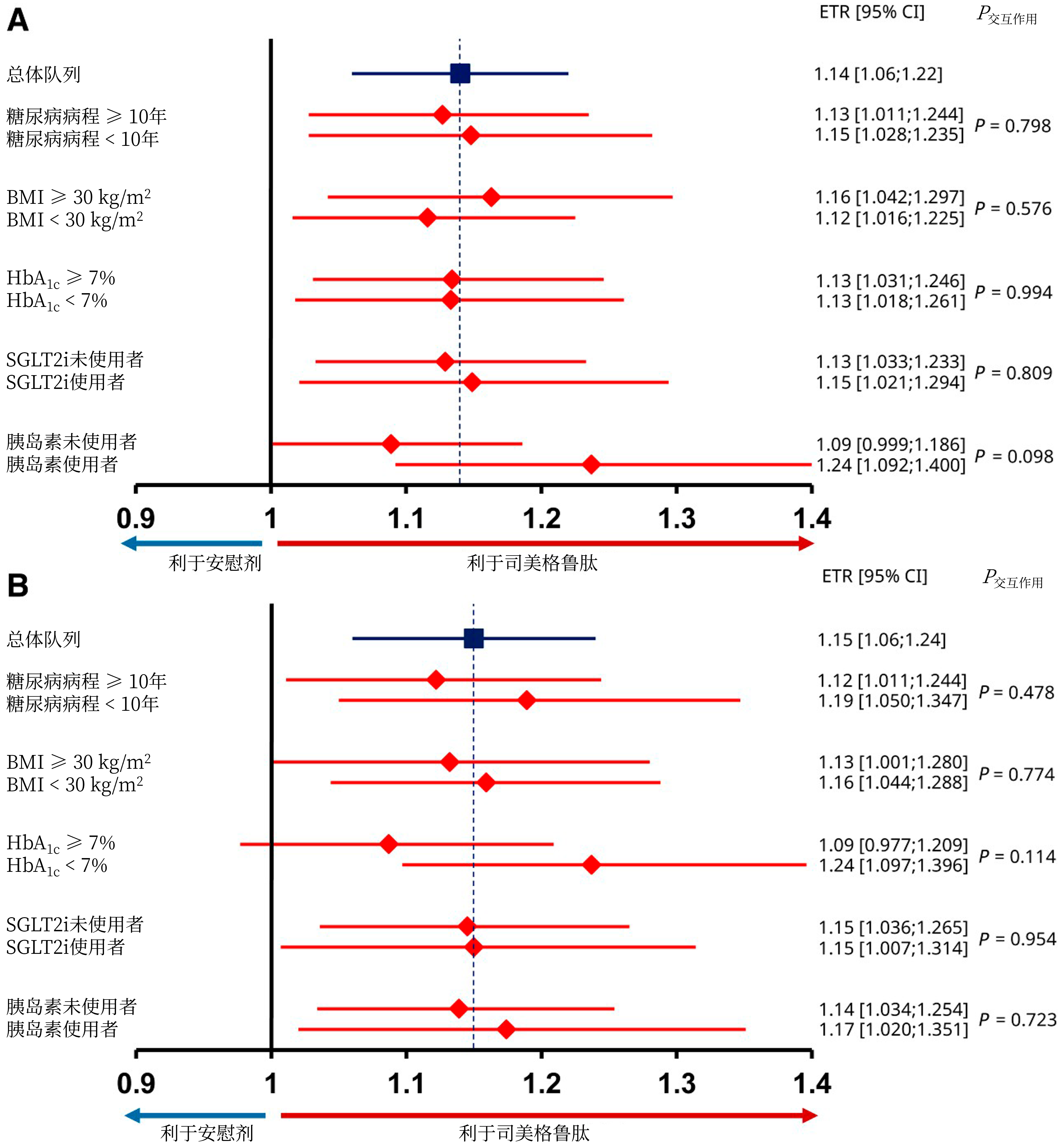 图3. STRIDE研究中根据T2DM特征分层的MWD(A)和PFWD(B)改善情况
