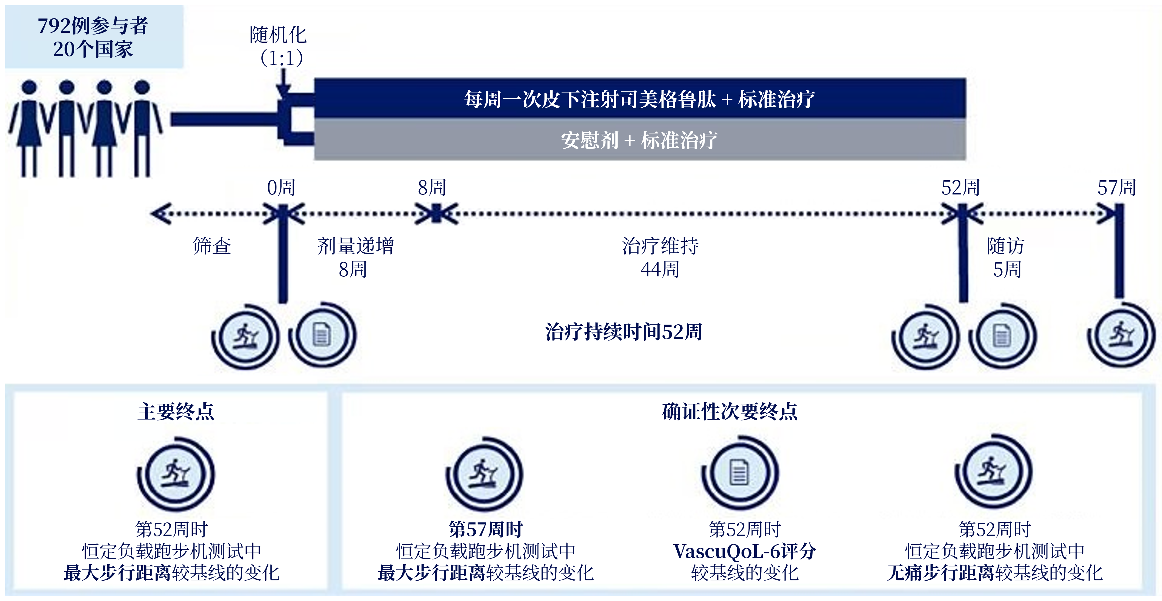 STRIDE研究是一项3b期、双盲、随机、安慰剂对照试验,于2020年10月1日~2024年7月12日从北美、亚洲和欧洲20个国家112个门诊研究中心开展。研究入选T2DM合并间歇性跛行(Fontaine IIa期)的PAD患者,踝肱指数(ABI)≤0.90或趾肱指数(TBI)≤0.70。所有患者在标准治疗基础上,以1:1比例随机分配至每周一次皮下注射司美格鲁肽1.0 mg组或安慰剂组,治疗为期52周。主要终点为第52周时恒定负载跑步机测试中最大步行距离(MWD)较基线的变化;确证性次要终点包括第57周时MWD较基线的变化、第52周时血管生活质量问卷-6(VascuQoL-6)评分较基线的变化,以及第52周时无痛步行距离(PFWD)较基线的变化(图1)[3]。