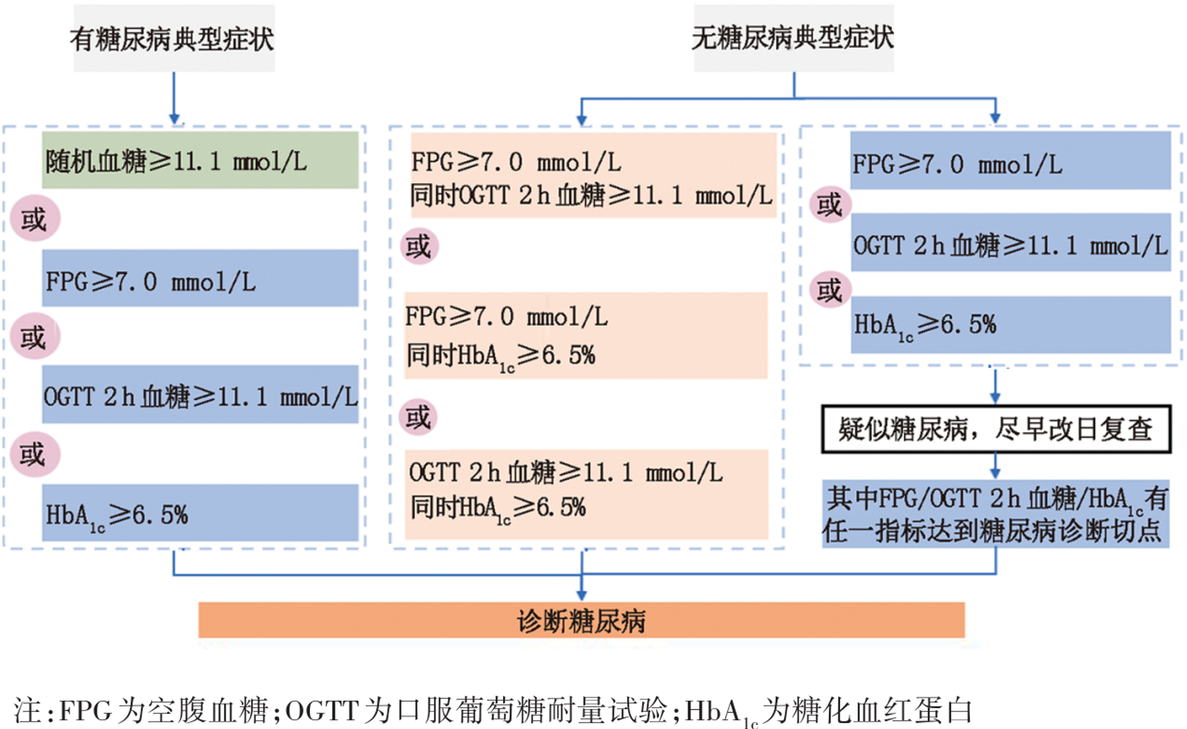 准确诊断是糖尿病管理的首要环节,必须确保严谨无误。根据指南明确的诊断标准,对于具有典型“三多一少”症状的个体,只要以下任一指标达标即可确诊:FPG≥7.0 mmol/L,或餐后2小时血糖≥11.1 mmol/L,或HbA1c≥6.5%,或随机血糖≥11.1 mmol/L(所有检测均须采用标准化方法)。若缺乏典型症状,则需满足同一时间点的两个血糖指标或两个不同时间点的血糖指标达到或超过诊断切点(随机血糖除外),方可诊断为糖尿病(图2)。这一诊断原则至关重要,能有效避免因单次检测误差导致的误诊。