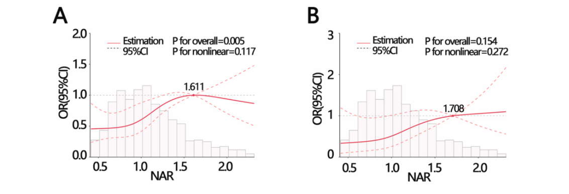 亚组分析进一步表明,该关联仅在BMI 25~30 kg/m2人群中显著(OR=3.086,95% CI: 1.378~7.129,P=0.007),提示在此超重亚组中,NAR每增加1单位,T2DM风险升高逾2倍。