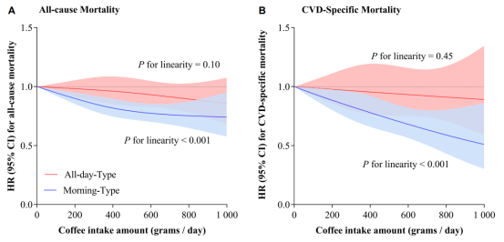 图1.不同咖啡饮用时间模式下,咖啡摄入量与死亡风险之间的剂量-反应关系(A.全因死亡;B.心血管死亡)