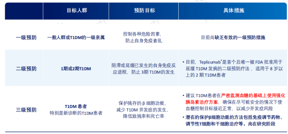 基于此,T1DM的三级预防也是针对其不同分期实施精准干预(表1)。一级预防面向一般人群或T1DM一级亲属,目标是控制危险因素以防止自身免疫紊乱,但目前尚无明确有效的临床措施。二级预防针对1期或2期患者,2022年美国FDA批准的Teplizumab(抗CD3单克隆抗体)成为首个延缓T1DM发病的药物,适用于8岁以上2期患者。三级预防则聚焦于已确诊患者,核心策略是通过强化胰岛素治疗保护残存β细胞功能,同时探索免疫调节药物、干细胞治疗等新兴手段[5]。