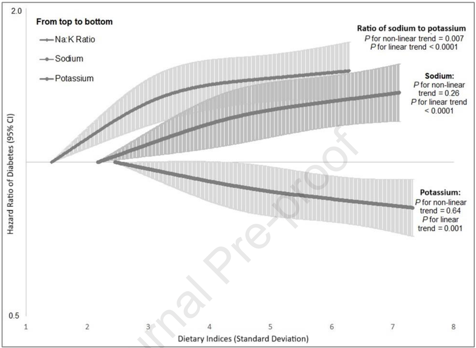 钠代谢被认为可通过影响血压调节、血管功能、氧化应激、炎症反应及胰岛素抵抗等途径,参与糖尿病发生过程。动物研究表明,在较高钠摄入4周后,胰岛素抵抗显著增加。此外,一项纵向研究观察到钠摄入量与T2DM风险之间存在剂量依赖关系。相反,更高的钾摄入以及较低的钠钾(Na:K)摄入比值被认为对血压控制具有益处,但其与糖尿病风险之间的关联仍需进一步阐明。本研究旨在探讨膳食钠、钾与T2DM的关联性,为生活方式医学中饮食干预策略的优化提供依据,进而助力T2DM的未来预防与治疗。
