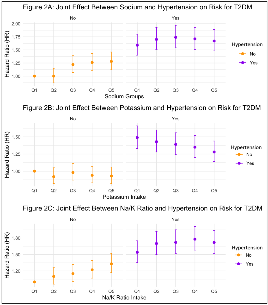 图2. 钠、钾或钠钾比与高血压共存对T2DM发病风险的联合影响