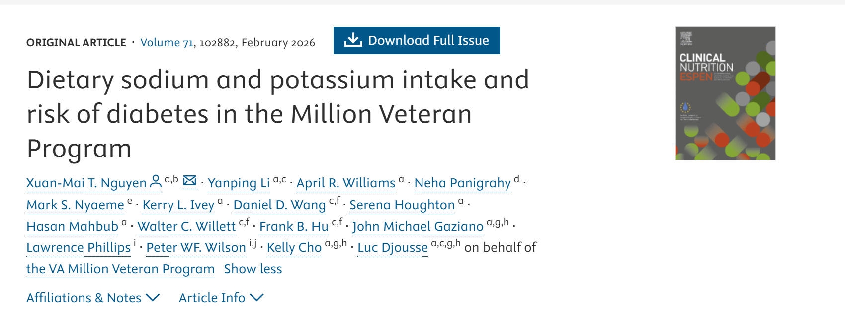 参考文献:Nguyen XT, Li Y, Williams AR, et al. Dietary sodium and potassium intake and risk of diabetes in the Million Veteran Program. Clin Nutr ESPEN. Published online January 3, 2026. doi:10.1016/j.clnesp.2025.102882