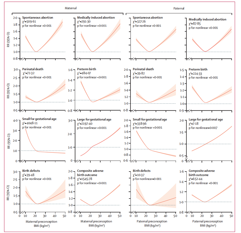 2025年,国家卫生健康委科学技术研究所马旭、杨英团队和中国科学技术大学包巍、刘步云团队发表于《柳叶刀·糖尿病与内分泌学》(The Lancet Diabetes & Endocrinology)的一项大规模队列研究为这一父母肥胖的跨代影响提供了强有力的中国本土证据。研究纳入2010~2020年全国孕前优生健康检查项目的878万家庭,评估了父母亲孕前体重指数(BMI)与不良出生结局之间的剂量-反应关系,并采用稳健Poisson回归模型计算父母亲孕前BMI与不良出生结局的风险比。结果显示,育龄夫妇孕前超重/肥胖,与子代多种不良出生结局显著相关,包括出生缺陷、早产、自然流产、医学性人工流产以及新生儿死亡等[10]。