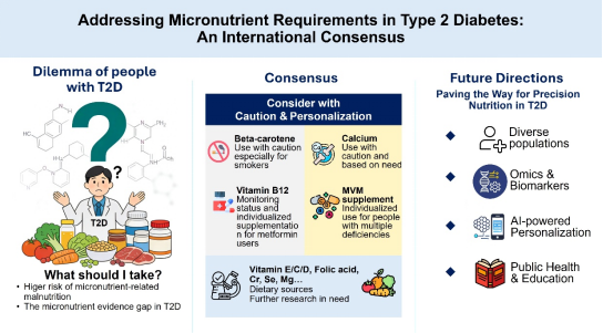 本共识指出,目前亟需开展更多涵盖多样化种族与地域人群的高质量研究,以明确糖尿病患者中微量营养素与健康结局的剂量-反应关系及最佳干预阈值。此外,未来研究应结合多组学技术,并利用人工智能(AI),开发针对个体遗传与代谢特征的精准营养干预策略。