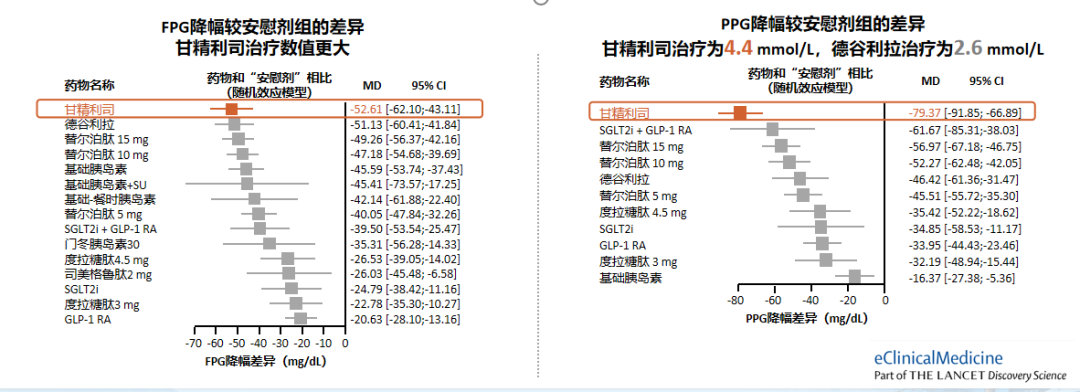目前已经上市的FRC中,甘精利司因含GLP-1RA短效制剂利司那肽,增加餐时胰岛素分泌和延缓胃排空的作用较强[19],在控制PPG方面更具优势。荟萃分析显示,不同降糖方案(包括替尔泊肽、甘精利司、德谷利拉等)中,甘精利司能够强效降低FPG和PPG,PPG改善尤为显著,较安慰剂差异达4.4 mmol/L[23]。