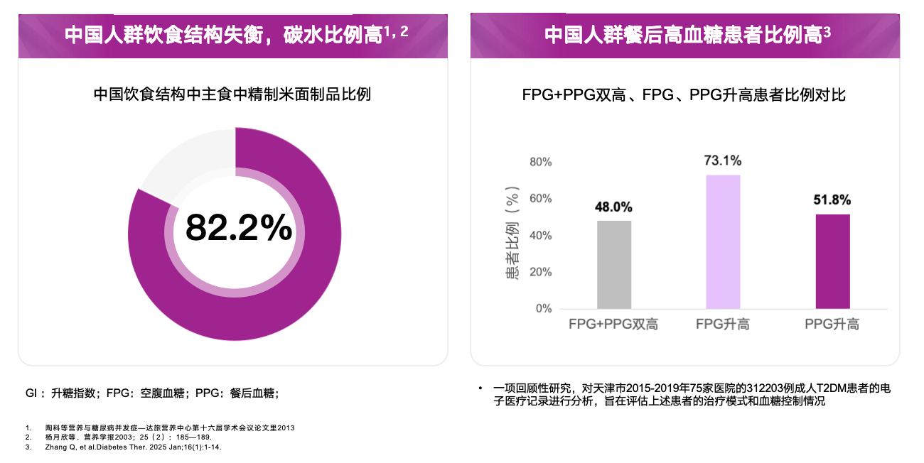 饮食结构埋下“餐后高血糖”伏笔。我国以精制谷物为主的膳食结构特征显著,T2DM患者主食中精制米面制品占比高达82.2%[8]。常见米面制品多属于高升糖指数(GI>80)的碳水化合物,导致PPG的升高幅度更大[9-10]。餐后高血糖不仅是整体达标率不足的重要原因,也是血糖波动加剧的核心因素;而血糖波动对于糖尿病慢性并发症的危害甚至比持续性高血糖更为严重[11-12]。