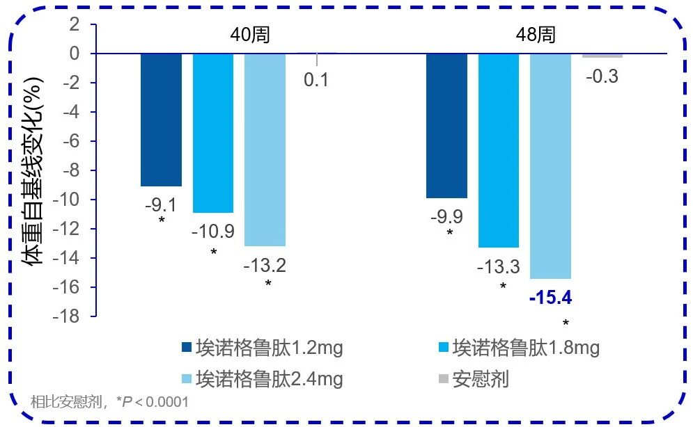 共同主要终点:治疗第40周时,受试者体重较基线的百分比变化,以及体重下降≥5%的受试者比例[4]。