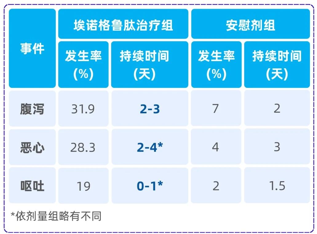 腹泻、恶心、呕吐这类胃肠道不良事件的中位持续时间也较短,与安慰剂组相似(表2)[4]。