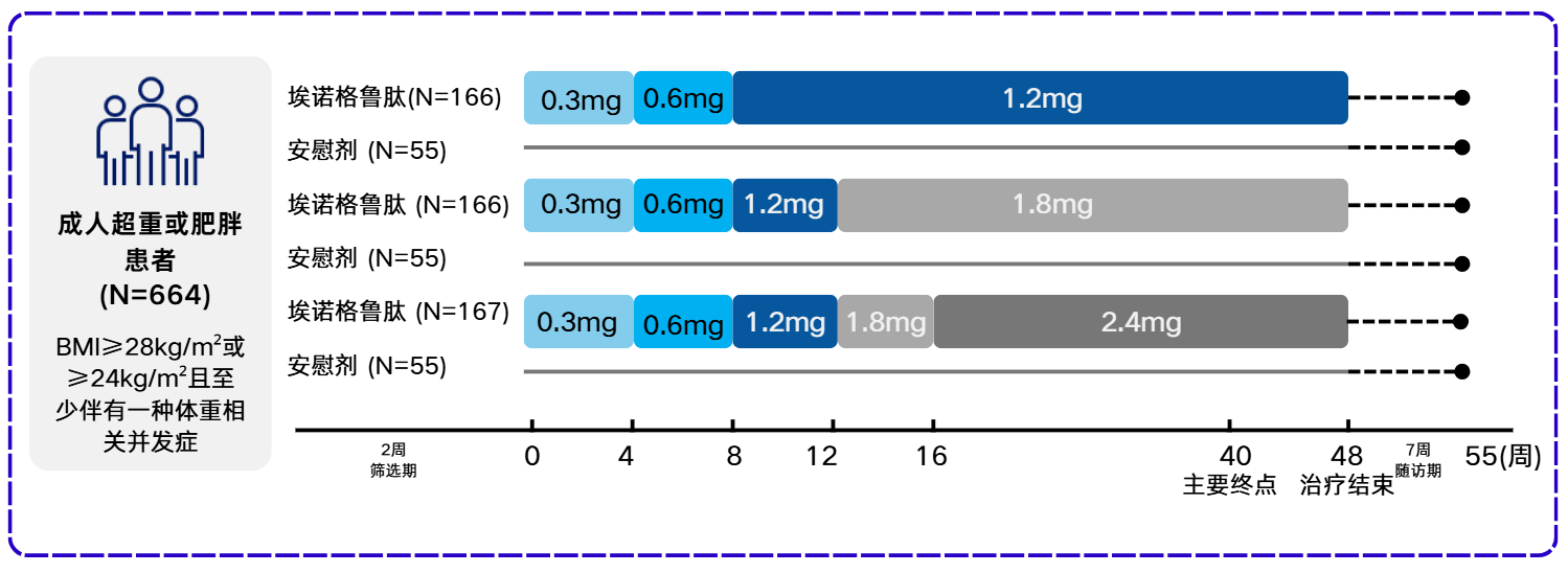 SLIMMER研究由北京大学人民医院纪立农教授牵头,是一项在中国36家医院进行的多中心、随机、双盲、安慰剂对照Ⅲ期临床试验。研究共纳入664例超重或肥胖患者,以3:3:3:1:1:1比例随机分配,分别接受埃诺格鲁肽(1.2 mg、1.8 mg、2.4 mg)或剂量匹配安慰剂(1.2 mg、1.8 mg、2.4 mg)治疗,旨在评估埃诺格鲁肽相比安慰剂在中国超重或肥胖非糖尿病成人中的减重疗效与安全性,为该人群的临床治疗提供基于本土人群的高质量循证医学证据[4]。