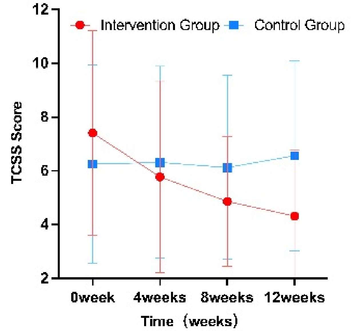 图2. 环形射频电场治疗组和安慰剂组TCSS评分的变化
