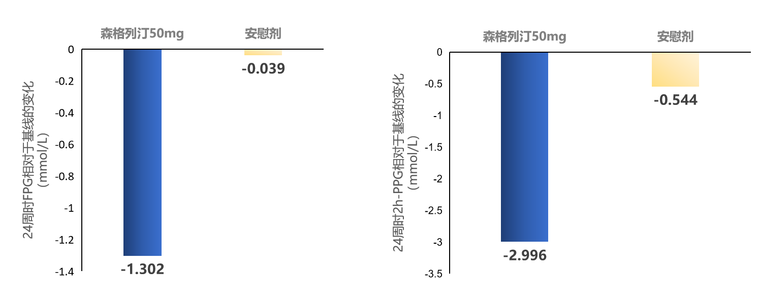 结果显示,在二甲双胍单药治疗血糖控制不佳的患者中,加用森格列汀24周可使HbA1c进一步下降1.23%,较安慰剂组额外降低0.79%,体现出非常强的降糖疗效。在达标率方面,HbA1c<7%的比例达51.1%,为安慰剂组的3.5倍;HbA1c<6.5%的比例为24.2%,为安慰剂组的5.5倍,这也是一个非常亮眼的成绩。