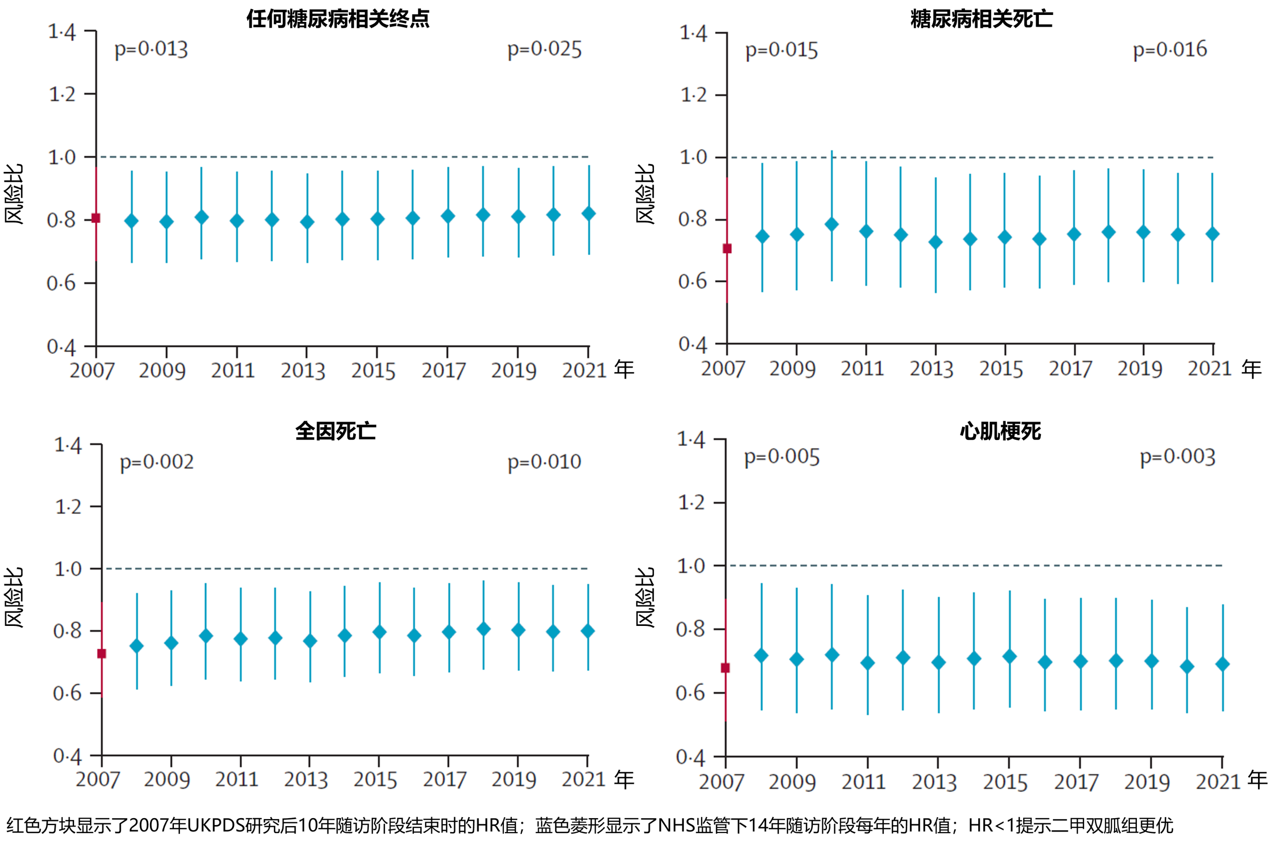 图2. UKPDS 91研究:二甲双胍vs.常规治疗的临床结局风险比(HR)值