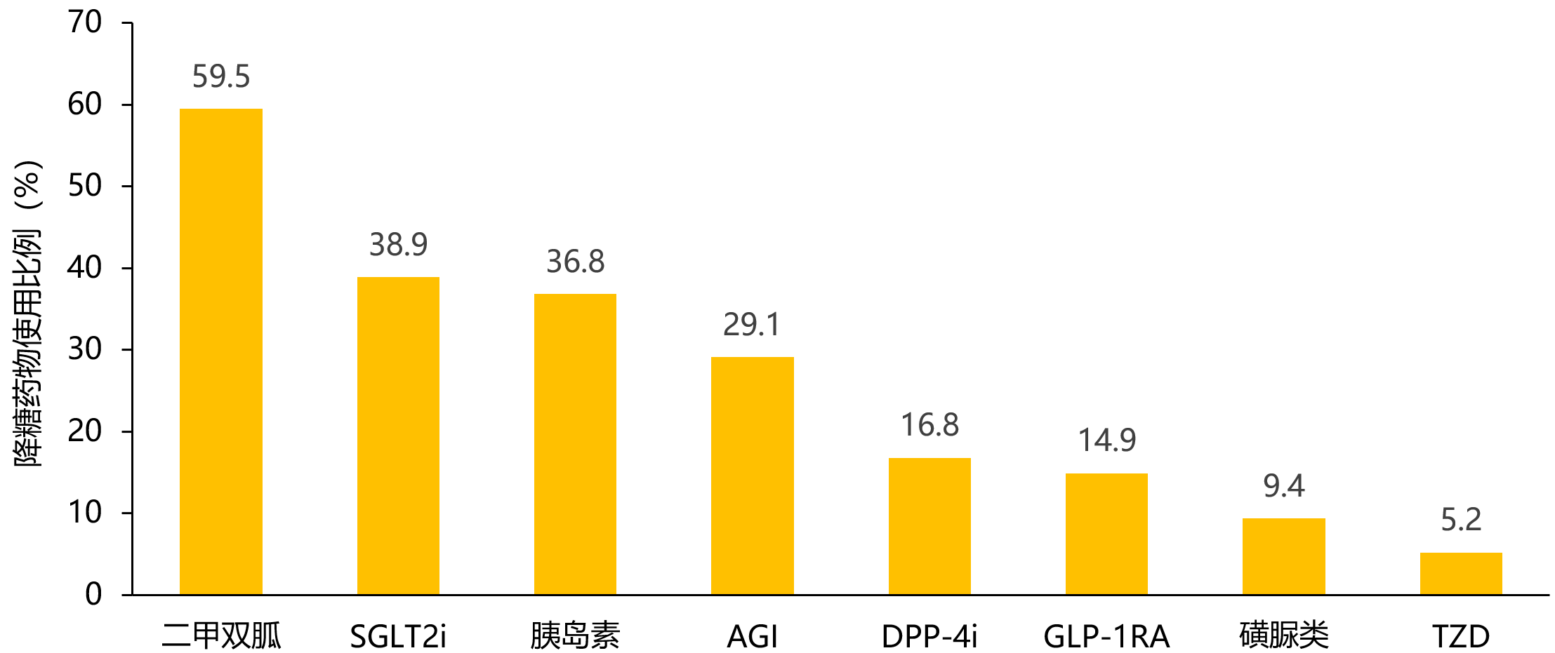另一方面,真实世界使用数据也进一步印证了二甲双胍的治疗地位。iCaReMe China是一项前瞻性、大规模观察性登记研究,从全国60家医院纳入9000例成人T2DM患者,结果显示,二甲双胍仍是中国T2DM患者常用的降糖药,使用率接近60%(图3)[6]。