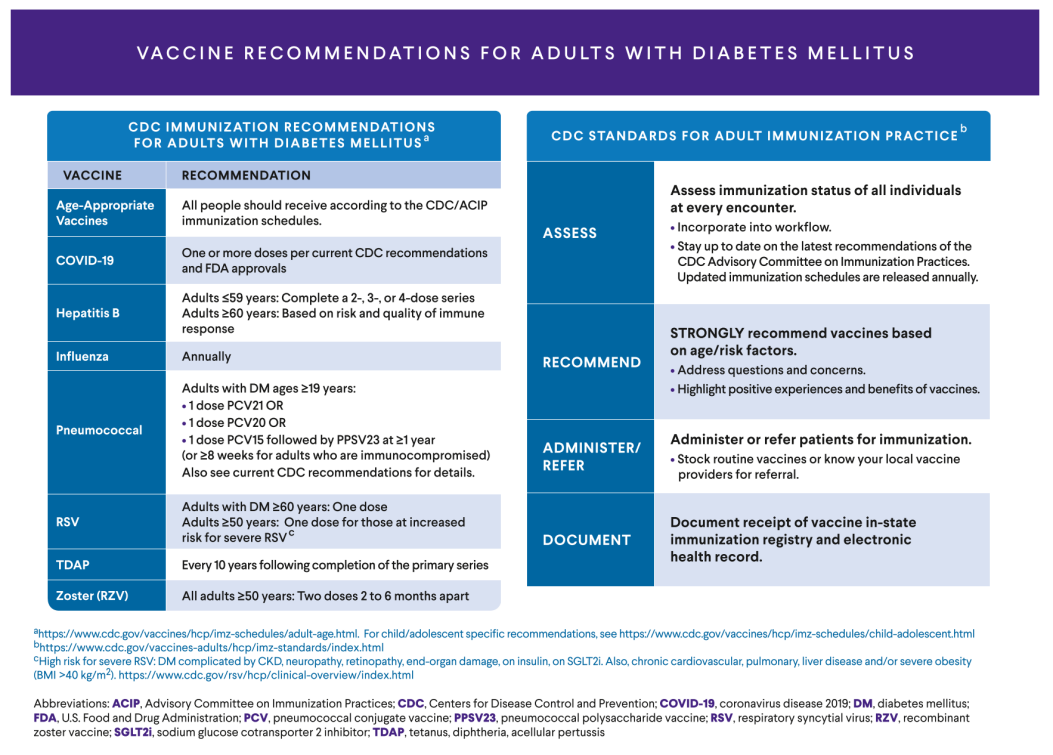 糖尿病患者感染风险较高,因此疫苗接种是综合管理的重要组成部分。应按照推荐完成流感、肺炎球菌及新冠疫苗接种。对于特定年龄人群,还应补充带状疱疹、RSV及Tdap疫苗,以进一步降低感染相关风险。