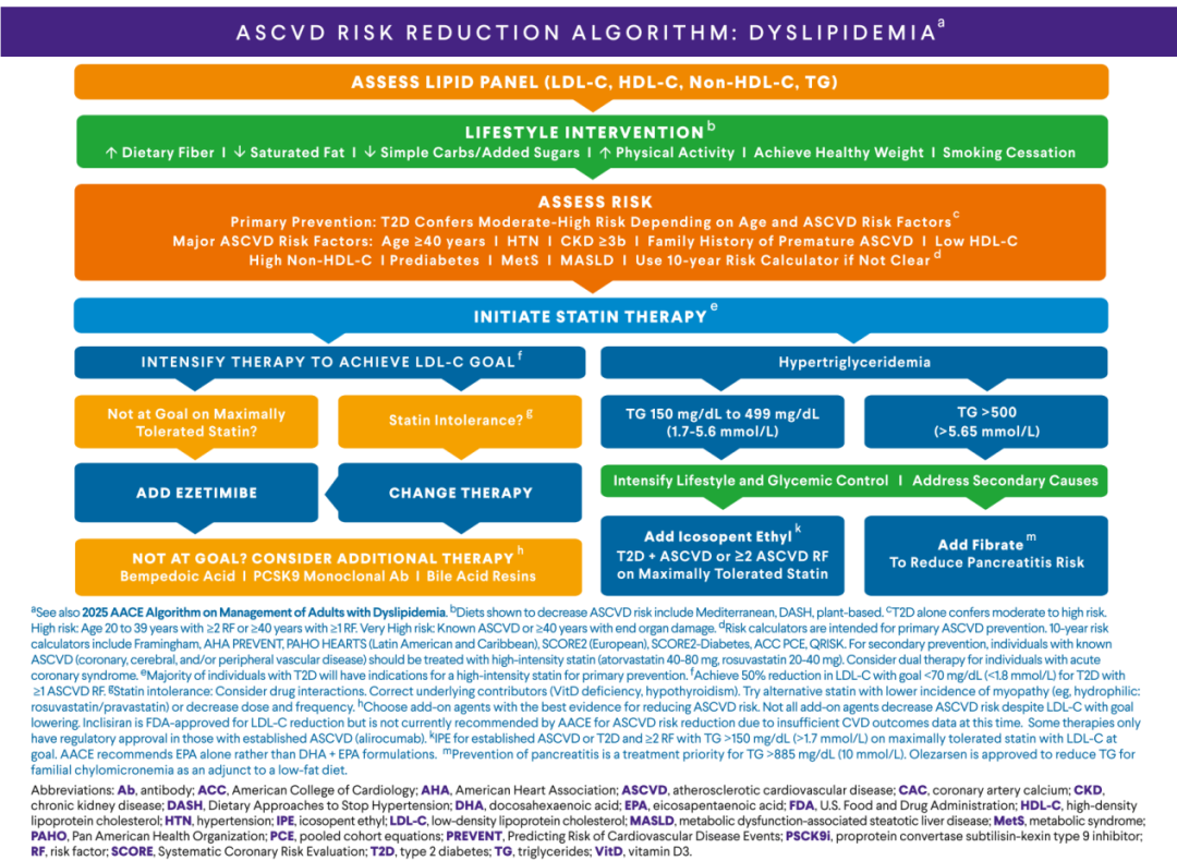 在药物治疗方面,应根据ASCVD风险分层选择治疗策略。他汀类为一线药物,不耐受者可调整剂量或更换药物。若未达标,可联合依折麦布或PCSK9抑制剂等进一步强化治疗。对于高甘油三酯患者,应根据水平采取相应措施,严重升高者需优先预防胰腺炎。