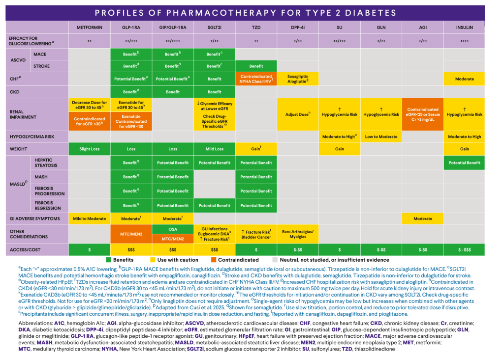 药物治疗选择需基于血糖目标及合并症情况综合决策,而非单纯依据血糖水平。对于合并超重或肥胖、ASCVD、慢性心力衰竭(CHF)、慢性肾脏疾病(CKD)、代谢相关脂肪性肝病(MASLD)及OSA等患者,应优先选择对相关并发症具有明确获益的药物。同时,治疗方案还需考虑药物的易用性、可及性及经济负担,以提高依从性和长期治疗效果。