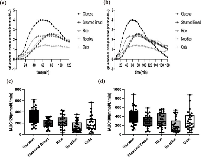 图2. 午餐摄入葡萄糖、蒸面包、米饭、面条和燕麦后的血糖反应曲线(120分钟:a;180分钟:b),以及对应的iAUC120(c)和iAUC180(d)分布情况