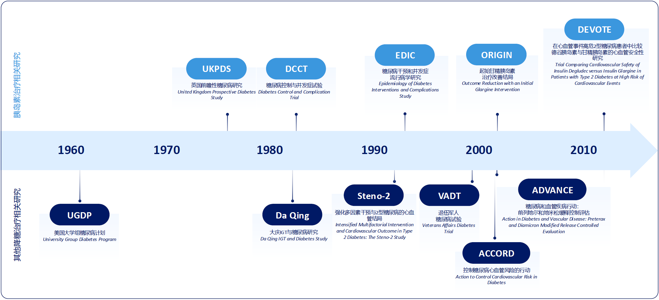 同时,一系列大型临床研究对胰岛素治疗的探索,促进了糖尿病管理理念的持续发展(图2)。例如,DCCT/EDIC研究证实,早期强化胰岛素治疗可带来长期获益[8]。UKPDS研究证实了新诊断2型糖尿病(T2DM)患者早期强化治疗可带来长期并发症获益[9]。这些研究开创了以长期硬终点为导向的循证实践范式,引领现代医学进入以高质量证据为决策核心的循证时代[10]。